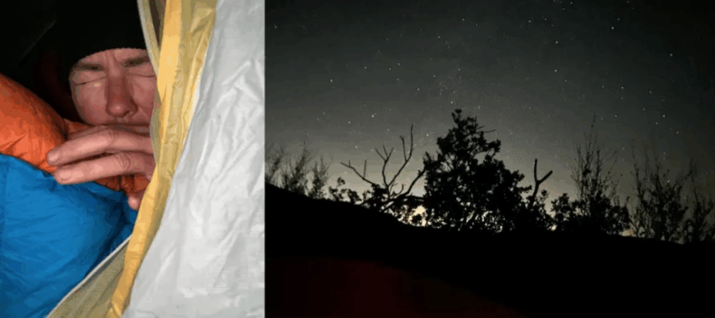 Of course, just when I’m comfortably horizontal, nature calls again. I drag myself out of the tent, the dog insists on coming with me, and chaos follows. But then… I look up. The night sky is breathtaking! Stars scattered across the sky like glitter on black velvet. After getting back into the warmth of my sleeping bag, I decide to capture the beauty of the sky. Flash. Right in my face. My phone was on selfie mode, so I immortalize my blinded look instead! Attempt two: Success.